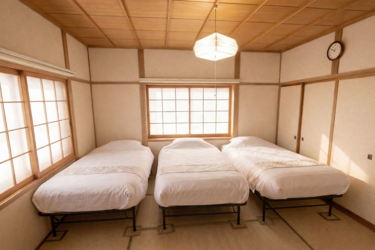 Situato a 90 minuti dall'aeroporto di Chitose, a 60 minuti da Sapporo, a 30 minuti da Otaru e a 60 minuti da Niseko. Situato lungo la costa. Con quattro camere da letto e 1,5 bagni, questa struttura può ospitare comodamente 6-8 persone. La cucina completamente attrezzata ha tutto il necessario per cucinare in autonomia. Goditi barbecue all'aperto, falò e fuochi d'artificio. (Il set per barbecue e il braciere sono forniti gratuitamente.) A 3 minuti a piedi si trova un minimarket. Parcheggio gratuito disponibile. Wi-Fi ad alta velocità.