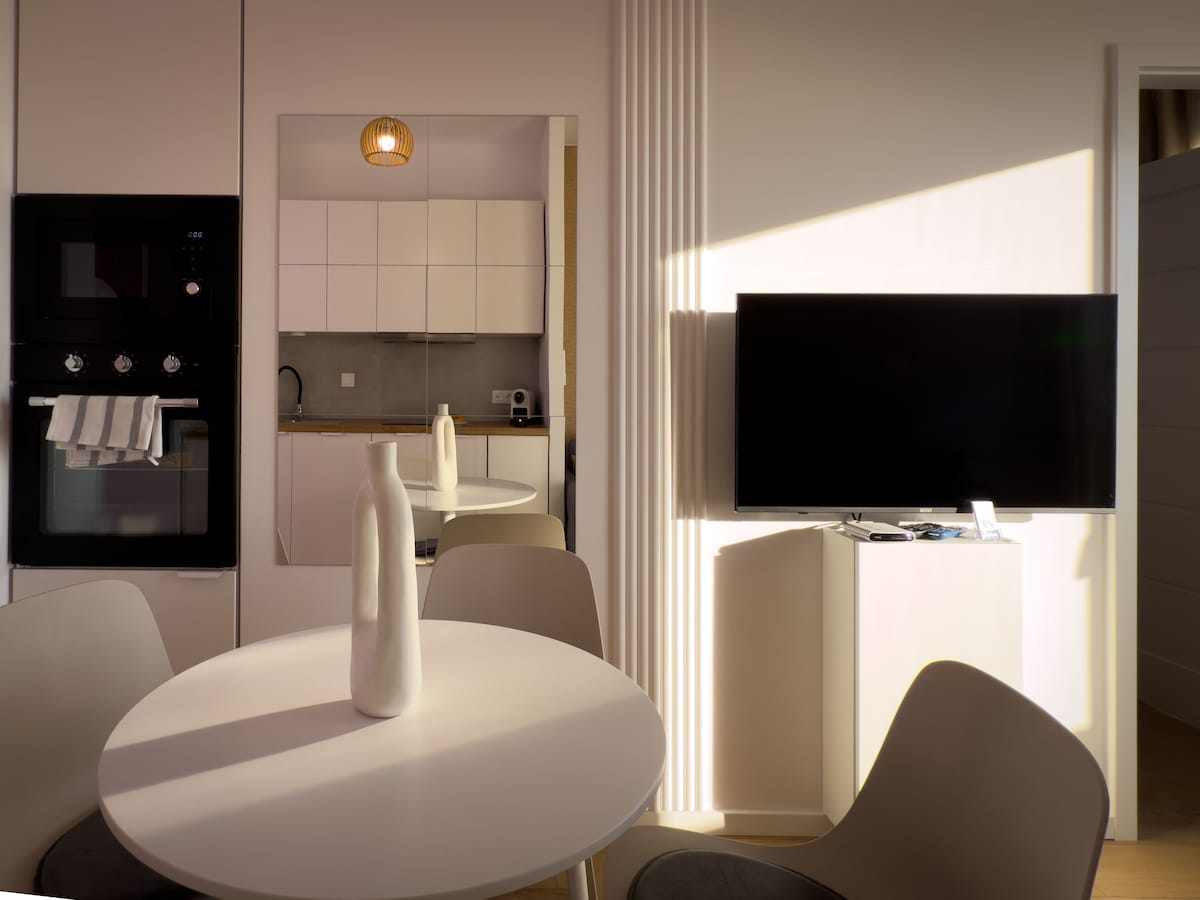 Two-room comfortable, air-conditioned apartment (45 m2) designed by an architectural firm in a modern boho style 🏡 - Bedroom with a double bed & designated workspace - Living room with a double sofa - Kitchenette with all the essentials including coffee machine & milk frother so that you can have your morning cappuccino - Bathroom with a shower, bidet, washing & drying machine and all the bath essentials - Balcony - 600 Mb/s Wi-Fi - Free parking space in the underground garage