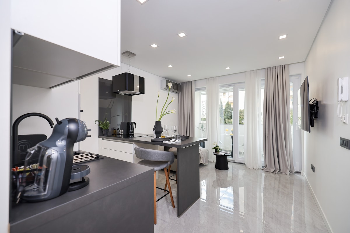 The Penthouse you've always dreamed of is waiting for you in Zadar! This newly made penthouse with a rooftop terrace with a hot tub, lounge area, and sauna is designed for those who want a royal experience for their holidays. This penthouse has two bedrooms, two bathrooms, a living room, and a kitchen as well as a roof terrace and a private parking spot. It is located 10 minutes walk from the old center of Zadar. Let me take you through the interior of our penthouse.