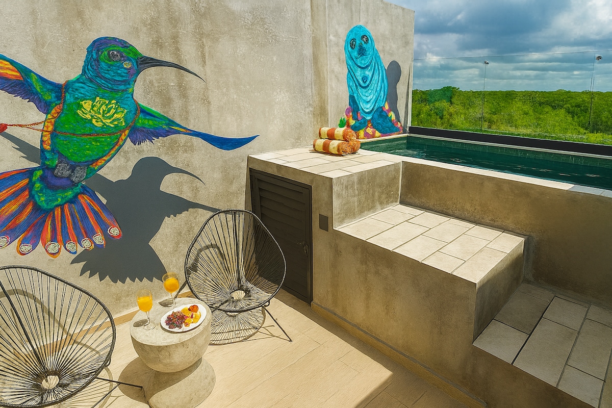 Jungle Oasis Loft w/ Private Plunge Pool & Terrace! Escape to this stylish 2nd-floor loft with a private terrace & plunge pool overlooking lush jungle views! Enjoy free bikes during your stay, a fully equipped kitchenette, and 24/7 security for peace of mind. Designed for couples, solo travelers & digital nomads, this modern retreat is cozy,quiet,and surrounded by nature just 15 min from the beach & downtown! Relax in your kingsize bed, dip in your pool,or explore nearby cenotes,beaches & more!