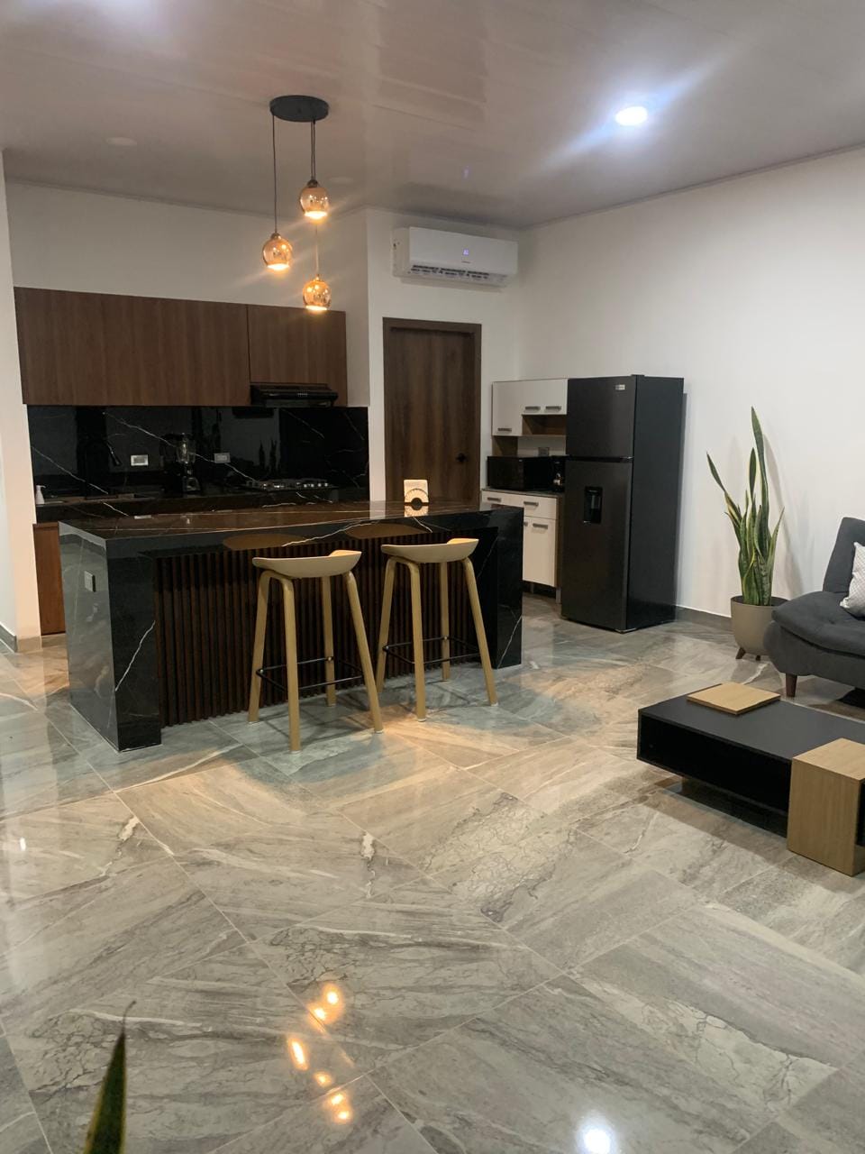 Relájate en una suite cálida y elegante pensada para parejas. Disfruta una cama amplia, iluminación suave, Smart TV gigante y una decoración en madera que crea un ambiente íntimo y relajante. La cocina está equipada para preparar algo especial, y también podrás disfrutar de la piscina y áreas exteriores tranquilas. Ubicación exclusiva en Unioro, cerca de restaurantes y zonas seguras para caminar en pareja.