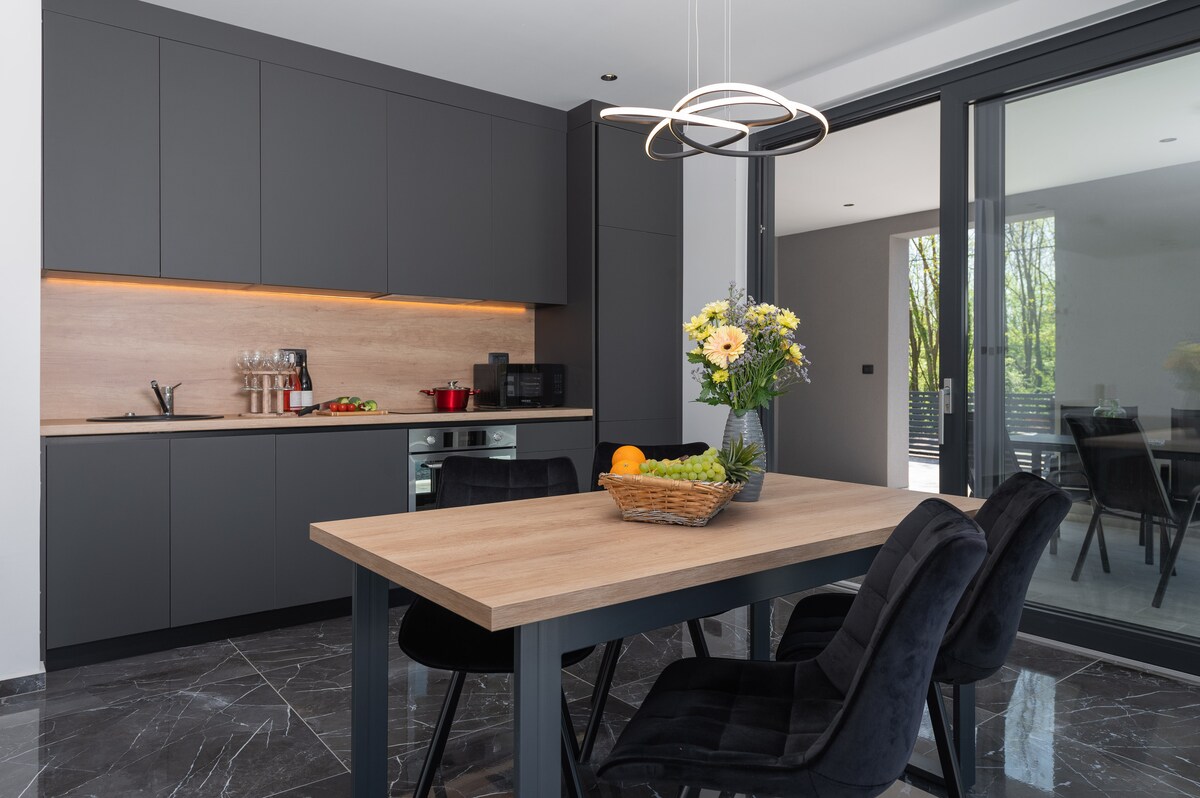 L'appartamento si trova vicino al centro di Abbazia, a pochi minuti di auto o a otto minuti a piedi. Si compone di un soggiorno, una camera da letto, una sala da pranzo, due bagni, una cucina, una sauna, un salotto open space, una terrazza, un giardino circostante e un parcheggio. Grazie al fatto di essere al piano terra con un giardino circostante si ha la sensazione di affittare una casa e non un appartamento.