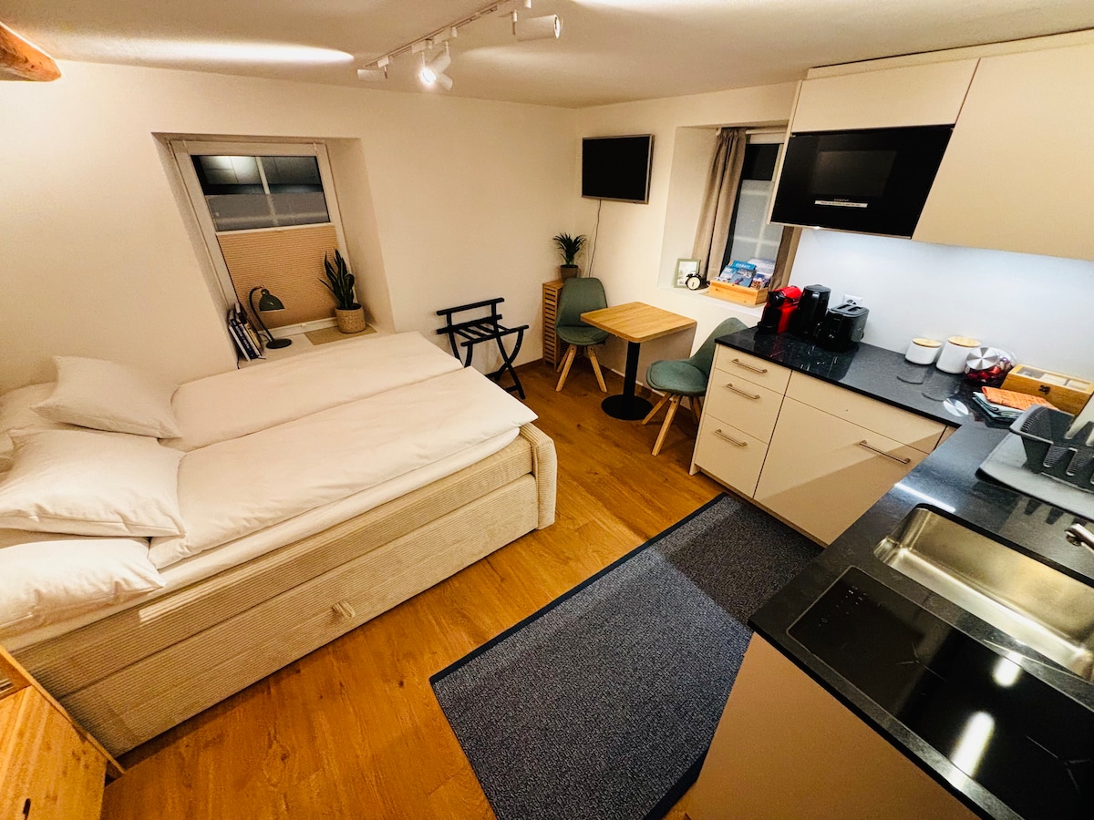 Il nostro monolocale ristrutturato si trova in una posizione centrale, a 5-10 minuti a piedi dalla stazione ferroviaria di Zermatt. Vale sempre la pena salire le scale della casa (90 gradini), perché l'alloggio è caratterizzato da molta luminosità e da una vista magnifica sul villaggio. Oltre a una cucina completamente attrezzata, l'appartamento è dotato di una vasca da bagno, un'accogliente area salotto e un letto di 1,80 m. Sono disponibili TV con Apple TV Box e Wi-Fi gratuito, nonché un deposito sci con serratura.