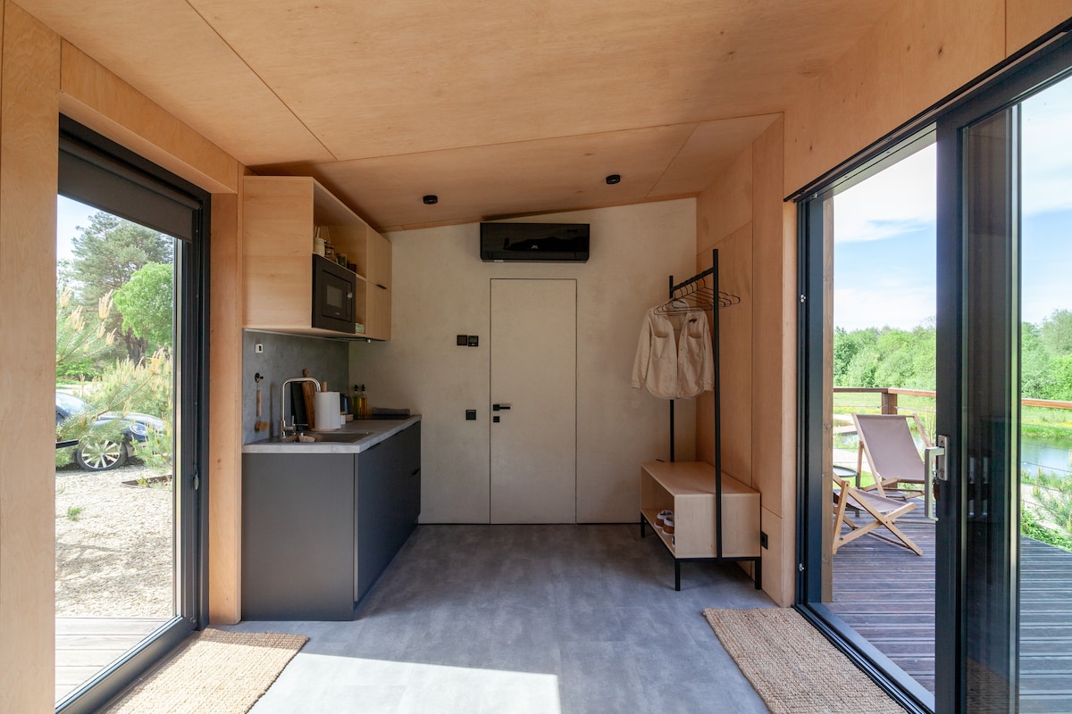 L'unità con la natura si respira meglio nella capanna accanto alla foresta. Ci sono coniglietti in giro, decine di uccelli che volano, scoiattoli che saltano, cespugli di mirtilli e more in fiore. E all'interno della casa tutto il necessario per una vacanza di qualità: finestre panoramiche, un grande letto con cuscini di canapa e una coperta, una stufa con legna da ardere, una comoda zona cucina, una doccia a pioggia con una fantastica vista sul tramonto. Una terrazza con zona relax, una ciotola per il fuoco e una tazza (vasca) sono a tua disposizione in qualsiasi momento.
