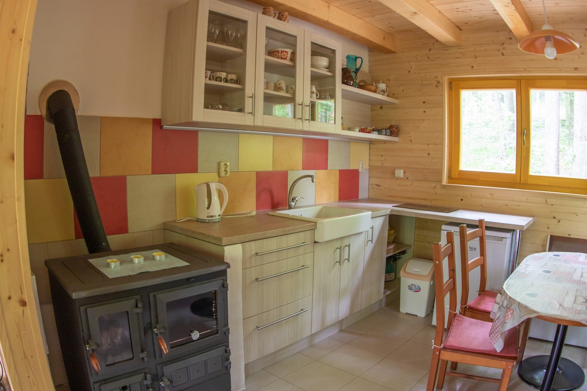 La baita si trova ai margini del paese in una bella posizione in mezzo alla natura. È indipendente con un focolare adiacente dove è possibile grigliare con un proprio ingresso. È possibile parcheggiare davanti ai garage della casa di famiglia dietro la recinzione, l'ospite ha a disposizione il proprio telecomando dal cancello e poi percorrere 100 m sul marciapiede fino alla baita.