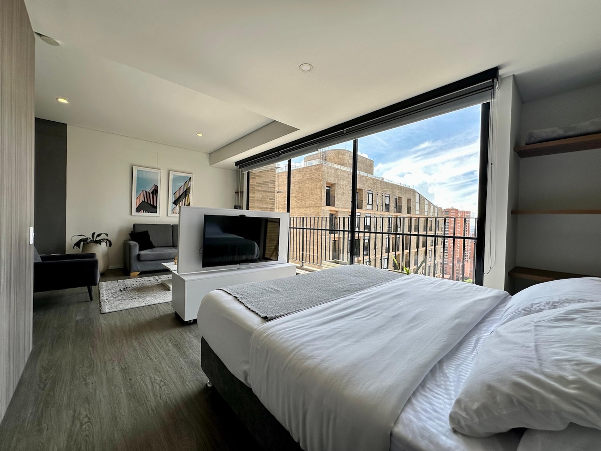 Goditi un loft di lusso nel cuore di Chicó Uno spazio moderno di 27 m² con balcone privato, letto di lusso, lenzuola extra morbide, tende motorizzate, specchio Bluetooth e luci a LED all'avanguardia. Ideale per lunghi soggiorni: dispone di una scrivania ergonomica, Wi-Fi 5G e Smart TV con Netflix, Disney+ e Prime Video. Include una lavatrice e la possibilità di pulizia settimanale con cambio della biancheria. Scopri Bogotá con stile e comfort.