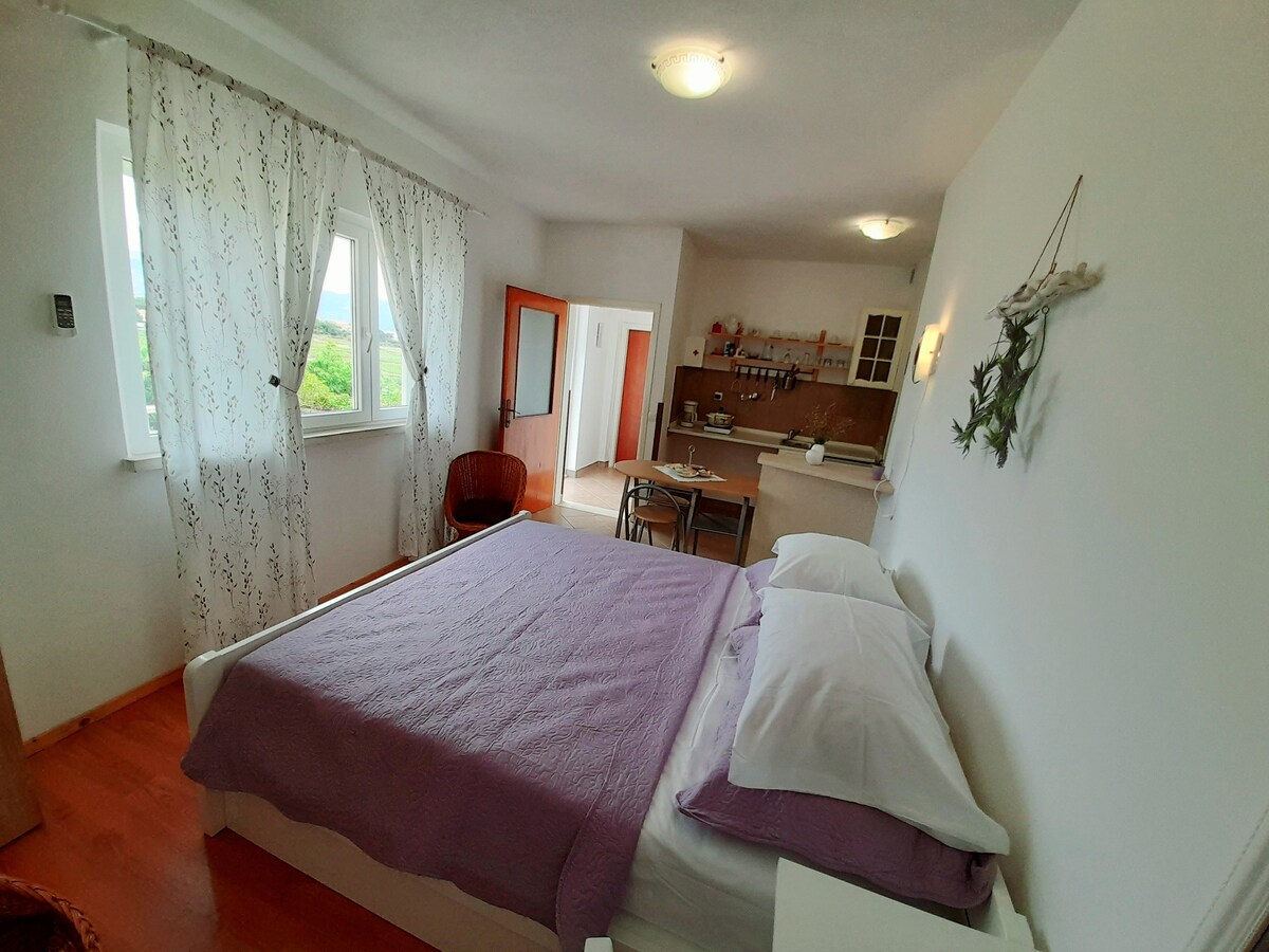 Apartment has 2 bedrooms with big stone beds (200x200), 1 bathroom, living room, kitchen and 2 terraces. It has also free wifi for all guests, swimming pool, parking space, air-conditioning... Swimming pool, barbecue and backyard are shared with guests from other 2 apartments. Pets are welcome.