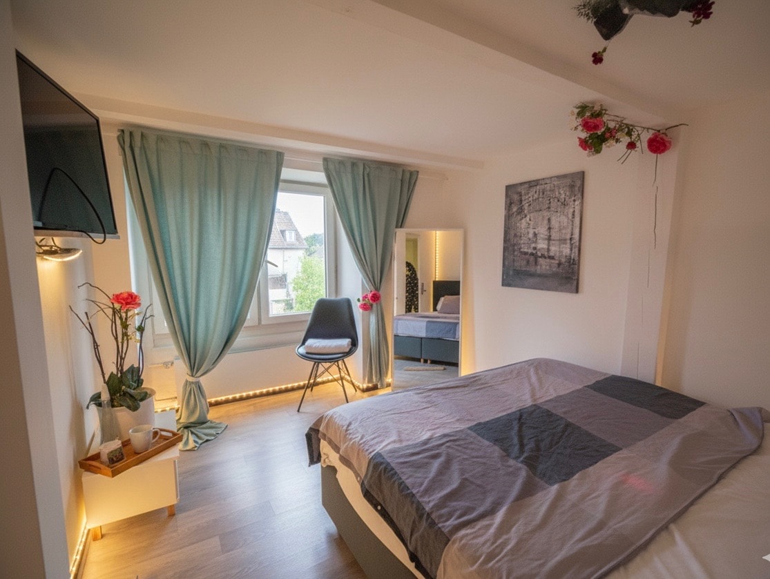 La camera da letto ha un letto matrimoniale (180×200 cm) con due comodini, un armadio e una spaziosa postazione di lavoro. L'intera stanza è arredata secondo gli stessi standard elevati dell'adiacente soggiorno e sala da pranzo con postazione multimediale. Grazie al divano letto, è possibile allestire una seconda camera da letto lì se lo si desidera, in modo che fino a 4 persone possano dormire nell'appartamento. La cucina separata è moderna e completamente accessoriata. Ogni appartamento è dotato anche di un bellissimo bagno con vasca.